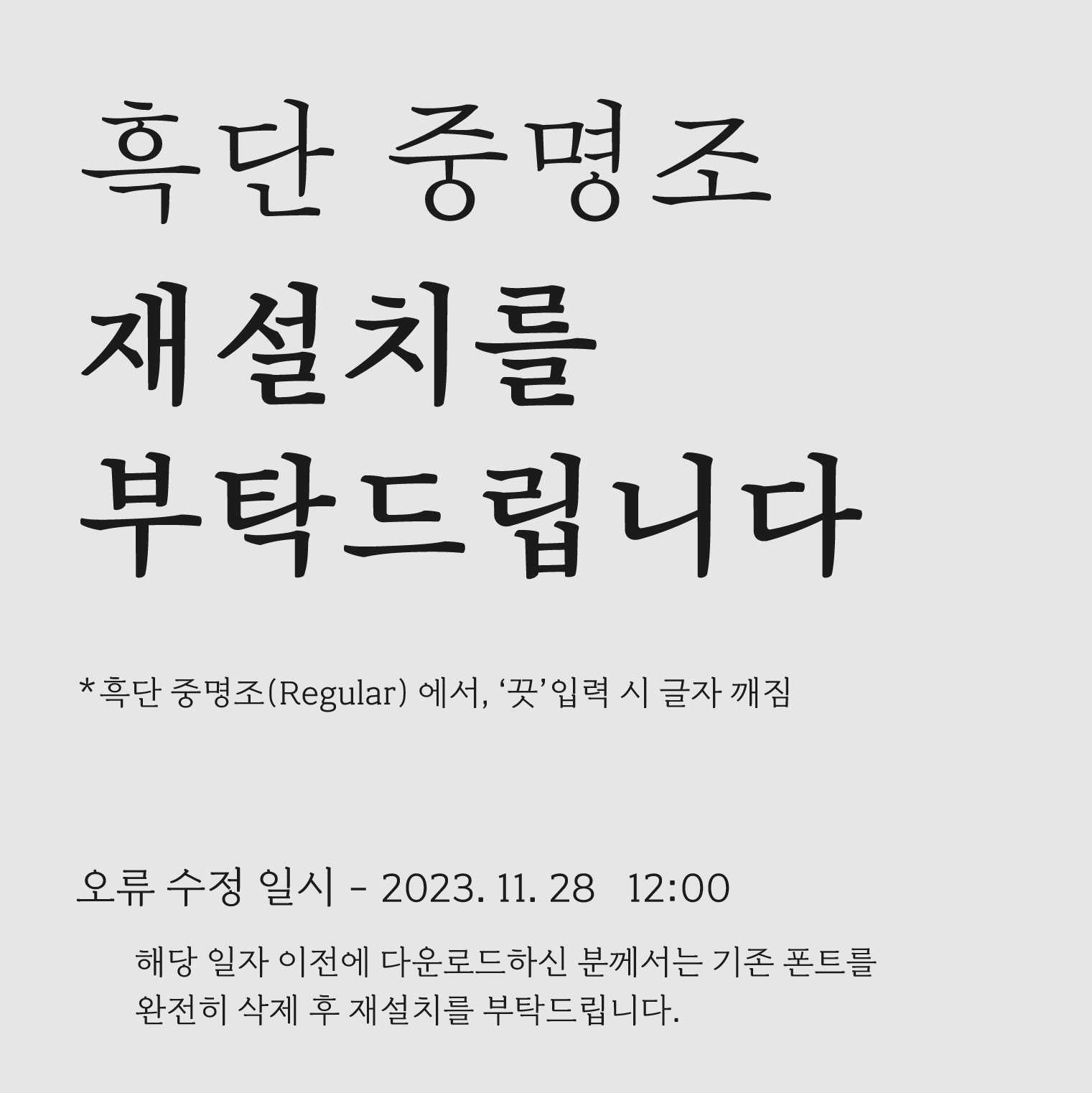 공지 23-11-29 15:29 [재설치 안내] '흑단 중명조' 폰트 오류 - 23.11.28 이전 파일 다운 시, 재설치 부탁드립니다.