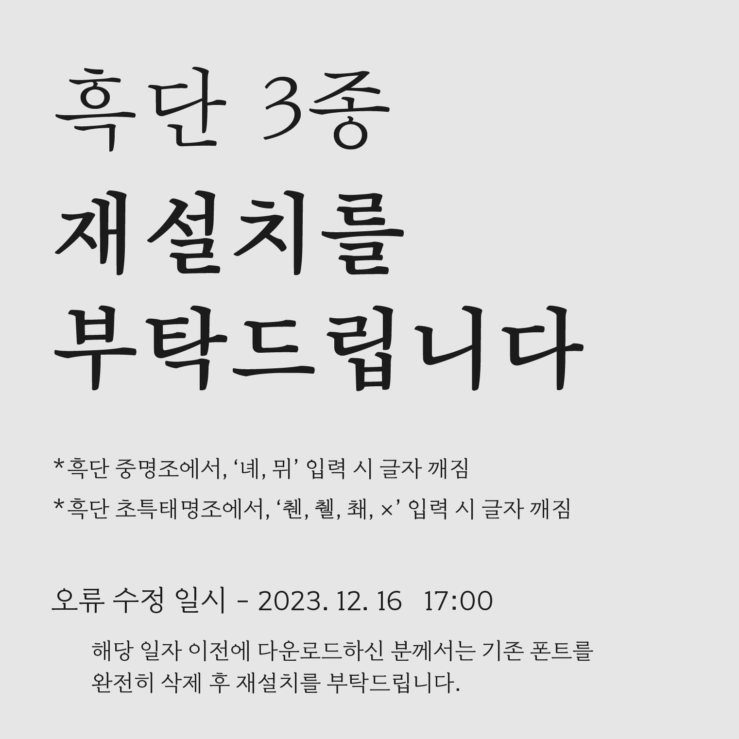 공지 23-12-16 17:26 [재설치 안내] '흑단' 폰트 오류 - 23.12.16 이전 파일 다운 시, 재설치 부탁드립니다.