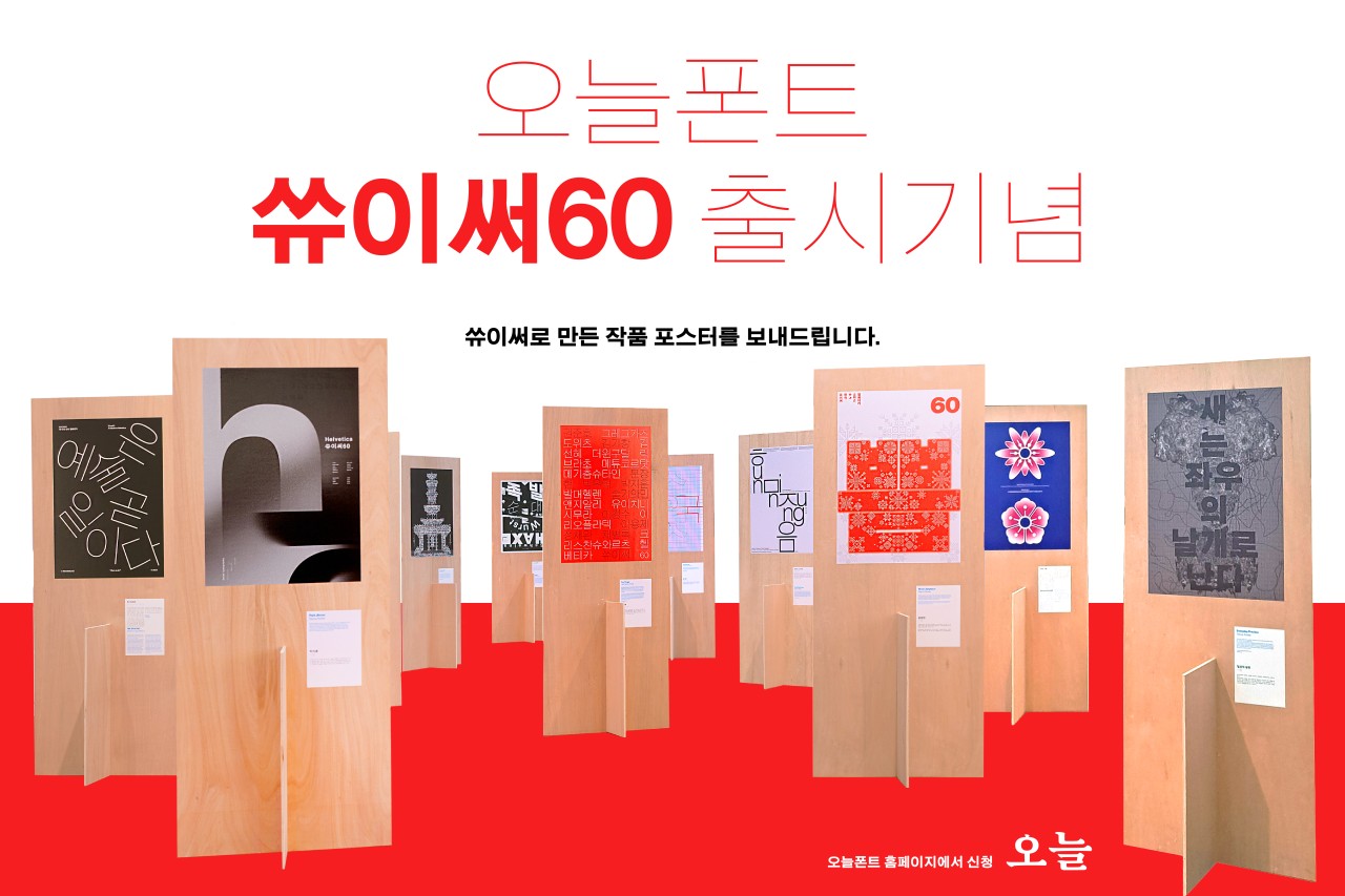 ‘쓔이써60’ 출시를 기념하여 특별한 선물을 준비했습니다. 국내외 디자이너 20명이 ‘쓔이써60’을 이용해 제작한 포스터를 드립니다. 이 포스터는 ‘한글 헬베티카 서밋 The Hangul Helvetica Summit’ 전에서 전시된 작품입니다. 20종 중 랜덤으로 2종을 보내드립니다.