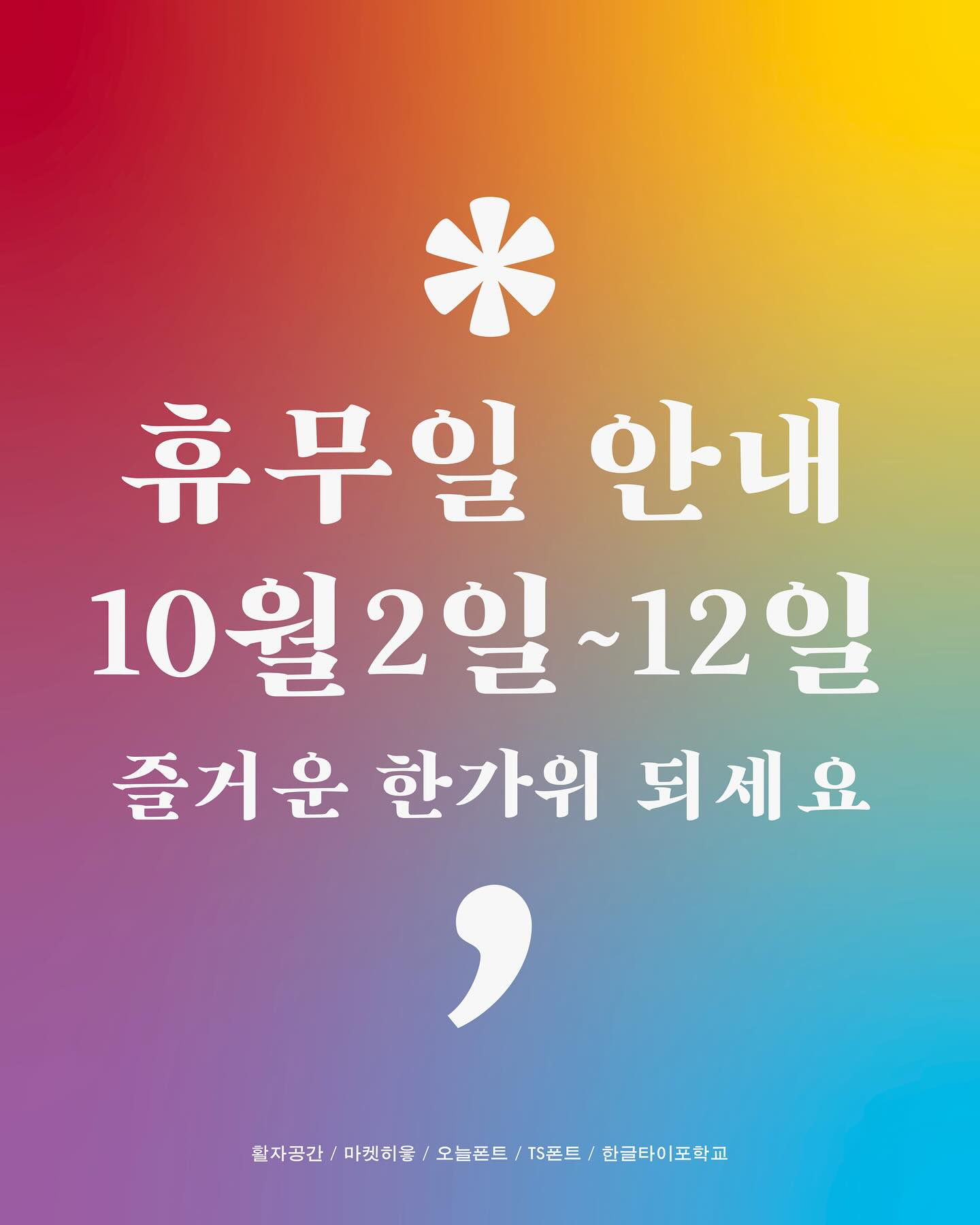 공지사항 공지 25-10-10 12:46 [알림] 2025년 10월 휴무 안내 본문 활자공간의 10월 추석 휴무일 운영을 알려드립니다.10월 1일(국군의 날) 10월 3일~8일(추석 연휴) 10월 9일(한글날) 1:1문의, 학생 인증, 탈퇴 신청 승인, 미완폰트 요청글자 운영을 멈춥니다. *** 긴 연휴, 가정 내 행복과 평안 가득하시기를 바랍니다. 즐거운 한가위 되세요! 오늘폰트를 이용해주셔서 감사합니다. 이전글MacOS 사용성 개선 업데이트 안내 (10월부 적용) 25.11.20 다음글[식목] 미완폰트 글자 추가 - 25.10.05 재설치 권장 25.10.10 목록