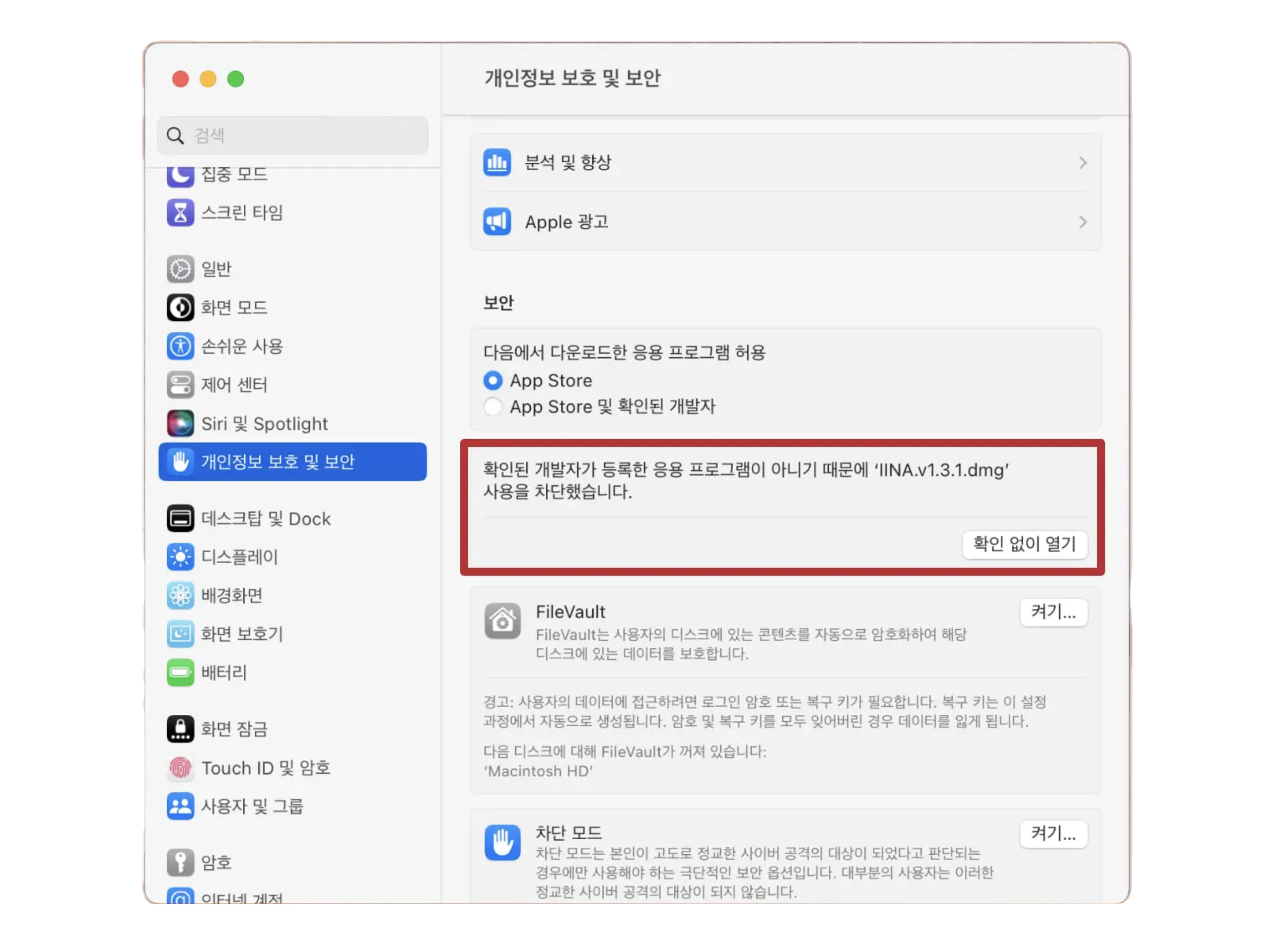 4. '확인된 개발자가 등록한 응용 프로그램이 아니기 때문에 0000.pkg' 사용을 차단했습니다.' >> '확인 없이 열기'