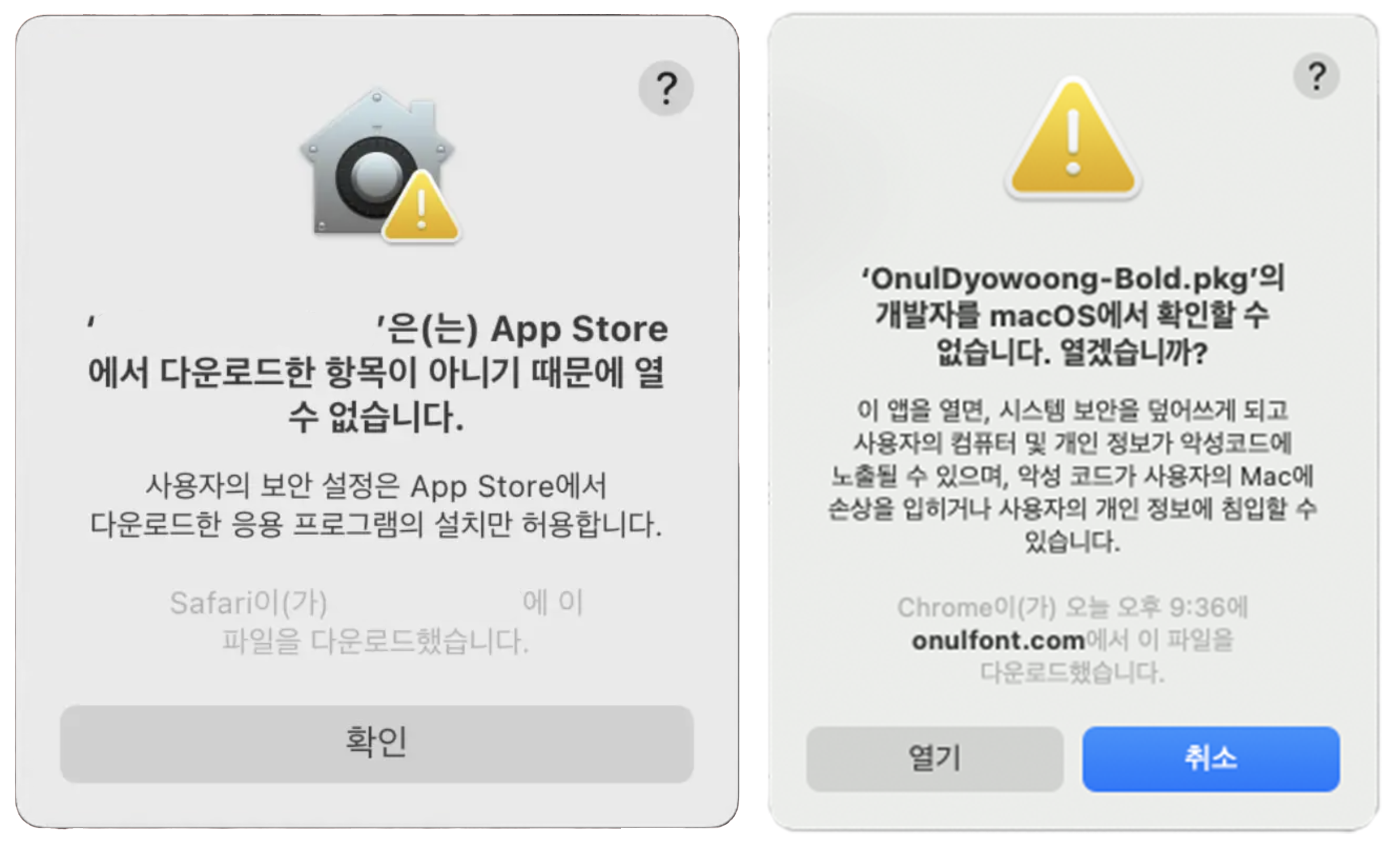 기타 [설치] Mac 에서 폰트 설치 시, '~열 수 없습니다' '~개발자를 확인할 수 없습니다' 해결방법